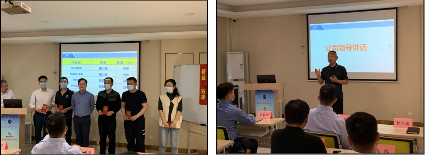 推进委员会李总做重要讲话:精益管理有两个概念,第一个概念就是省......省......省......,样板区里空间省出来了,样板区里损耗省出来了,样板区里环境变好(可视化、规范化)管理更省心了;第二概念是问......问......问......,现场推进精益管理时遇到问题及时提问,主动提问。精益管理有两把钥匙,第一把钥匙是大家各自行动,最终形成合力,共享经验;第二把钥匙就是要长期坚持,持续改善,形成高标。